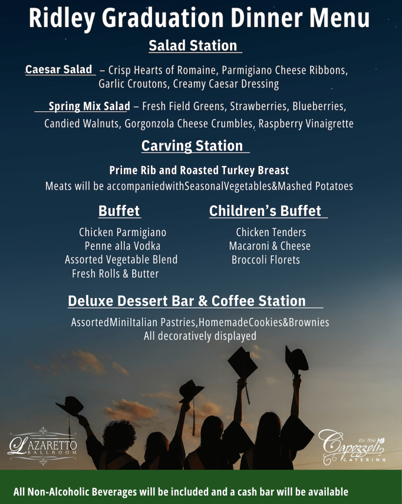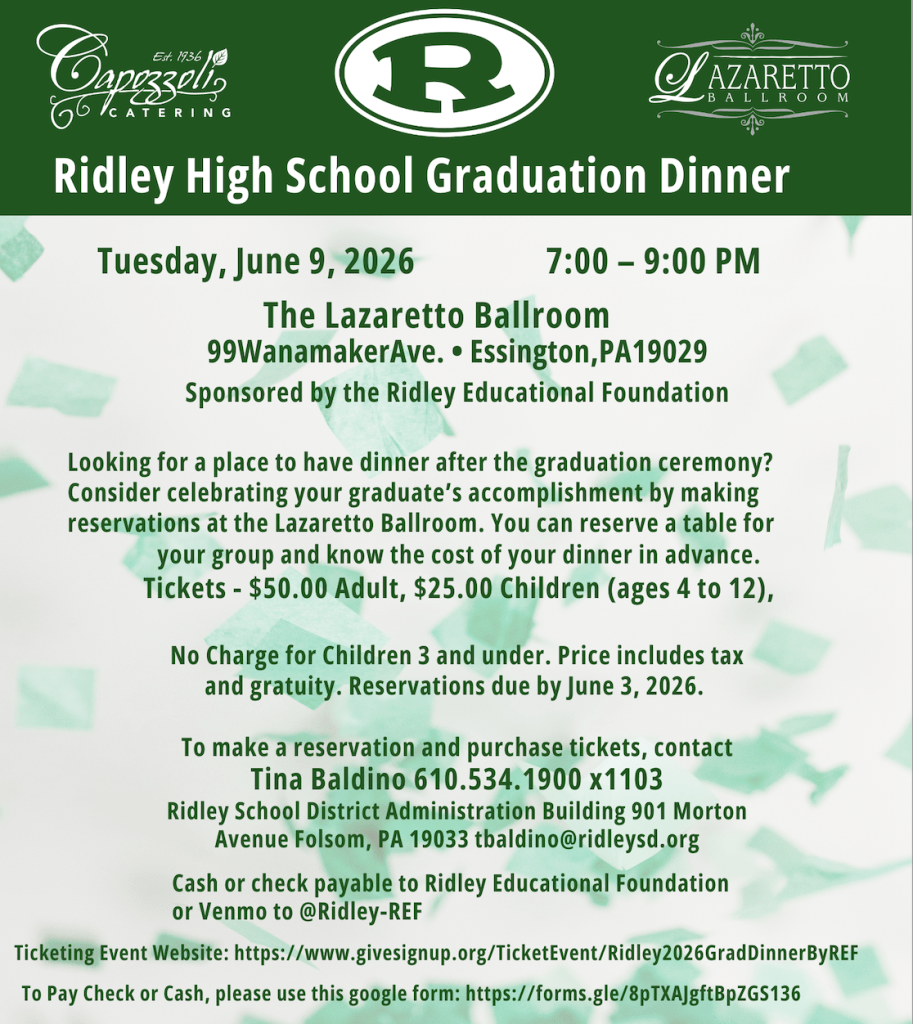 Deadline for reservations is June 3rd. Our ticketing event website for credit card purchases is: https://www.givesignup.org/TicketEvent/Ridley2026GradDinnerByREF